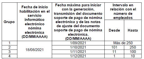 Respecto del plazo para generar y transmitir el documento soporte de pago de nómina electrónica del mes de septiembre de 2021, se estableció el 29 de octubre de 2021, para los sujetos que pertenecen al grupo 1. En todo caso, los anexos respectivos se deberán empezar a adoptar a partir del 31 de enero de 2022.